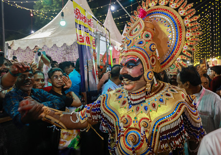 ニューデリーで開催されたヒンズー教の祭典「ダシェラ」で、邪悪な魔王に扮(ふん)してパフォーマンスするインド人アーティスト。ダシェラはヒンズー教の神ラーマが魔王に勝利したことを祝う祭り=2日 【EPA時事】
