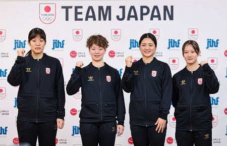 日本アイスホッケー連盟は25日、来年2月のミラノ・コルティナ五輪に臨む女子日本代表(スマイルジャパン)23人を発表した。写真は、代表に選ばれた(左から)浮田、小池、細山田、輪島=北海道苫小牧市 【時事通信社】