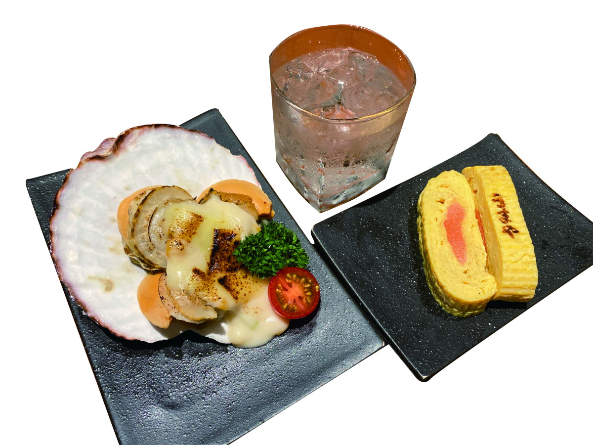 「うまや」の「ホタテ貝(怪)グラタンとJINソーダ(人)、博多に来る<博多明太卵焼き添え>!!」 CANAL CITY HAKATA 2025 © FJ. Entertainment Works