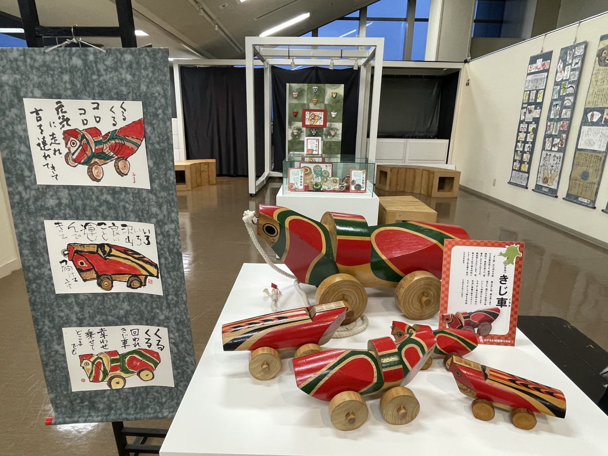「吉福!よかもん縁起物ひろば展」で展示する伝統工芸品「きじ車」と絵手紙