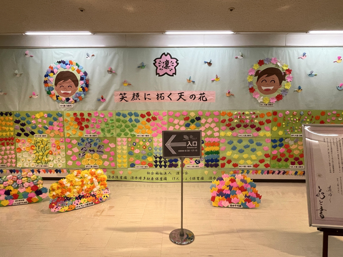 エレベーターホールに展示した園児による花のアート作品