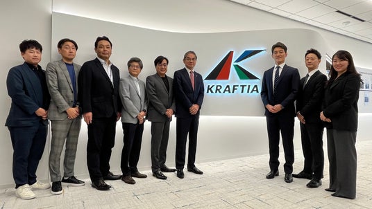【写真】「KRAFTIA Innovation Fund」設立を記念して撮影。ロゴの左右には、クラフティア 代表取締役社長執行役員 石橋 和幸氏(左)とクラフティアのメンバー、Spiral Innovation Partners ジェネラルパートナー 鎌田 和博(右)とSpiralのメンバーが並ぶ。