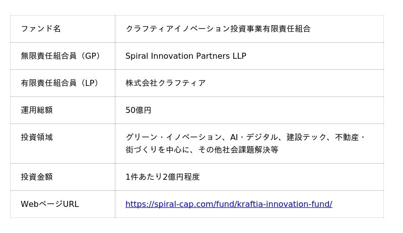 Spiral Innovation Partners株式会社(Spiral Capital株式会社〔本社:東京都港区、ジェネラルパートナー兼CEO 奥野 友和〕の子会社、以下「SIP」)は、傘下のSpiral Innovation Partners LLPを通じて、株式会社クラフティア(本社:福岡県福岡市、代表取締役社長執行役員 石橋 和幸、以下「クラフティア」)と共同で、50億円規模のCVCファンド「クラフティアイノベーション投資事業有限責任組合」(以下「KRAFTIA Innovation Fund」)を組成しました。
