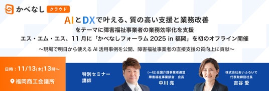 株式会社エス・エム・エス(本社:東京都港区、代表取締役社長:後藤夏樹、東証プライム、以下「当社」)が提供する、障害福祉事業者向け業務支援システム「かべなしクラウド」(URL:https://kabe-nashi.jp/)は、「AIとDXで叶える、質の高い支援と業務改善」をテーマに「かべなしフォーラム2025 in 福岡」を開催します。