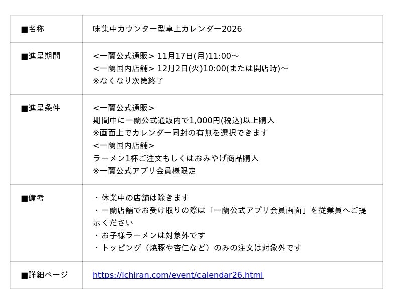 株式会社一蘭では、日頃のご愛顧への感謝を込め、「味集中カウンター型 卓上カレンダー2026」を進呈するイベントを実施いたします。