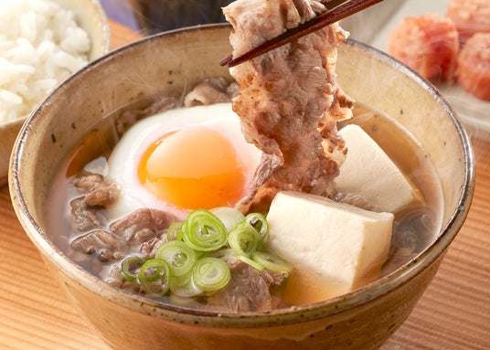 焼きあごだしの香りと旨みのある醤油ベースのつゆに、牛肉、豆腐、半熟卵が入ったボリュームある汁物おかず。博多の新たな名物になること間違いなし!