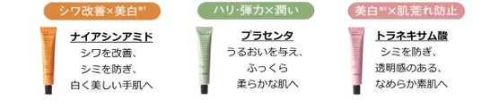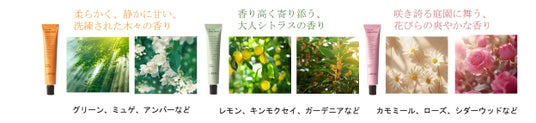 グリチルリチン酸を共通の有効成分として、ウッディブロッサムの香りにはナイアシンアミド、シトラスブーケの香りにはプラセンタ、フローラルブリスの香りにはトラネキサム酸を配合。年齢が出やすい手元のコンディションを薬用成分がサポートし、乾燥、シミ、シワ、血管浮き※2など多角的なアプローチを実現します。
