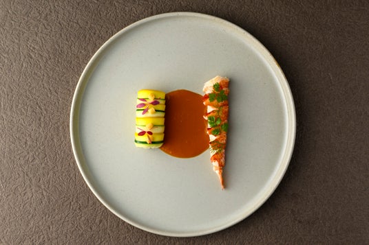 オマール海老のソテー、ソースアメリケーヌとズッキーニのカネロニ