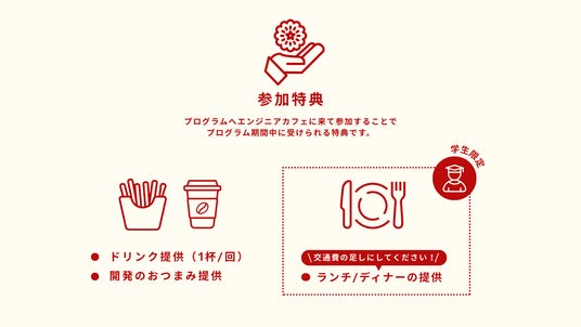 プログラム期間中にエンジニアカフェ現地に足を運んで参加した方向けの特典や、プログラム終了後も受けられる継続的な支援など手厚いサポートなど、エンジニアにとって魅力的に感じる手厚いサポートを用意しました。