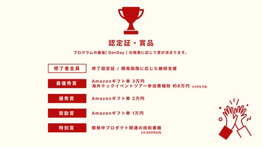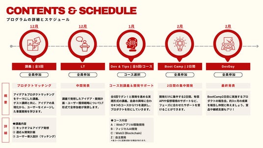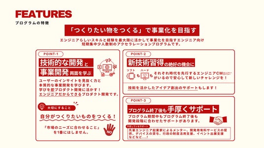 参加費は無料。エンジニアが自らのスキルと経験を活かし、事業を生み出すことを目的とした3ヶ月間の短期集中・実践型プログラムです。