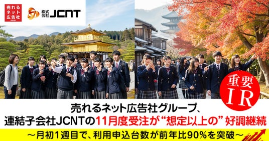 売れるネット広告社グループ株式会社(本社:福岡県福岡市、代表取締役社長 CEO:加藤公一レオ、東証グロース市場:証券コード9235、以下 売れるネット広告社グループ)のグローバル情報通信事業・連結子会社である株式会社JCNTの2025年11月の利用申込みが、11月第1週目時点で前年同月比の90%に達しており、10月に引き続き、申し込みが非常に堅調であることをご報告いたします。