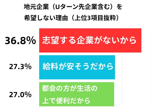 地元企業を志望しない理由株式会社マイナビ「2026年卒大学生Uターン・地元就職に関する調査」によると、「地元(Uターンを含む)での就職を希望する」と答えた学生は56.4%。つまり半数近い学生が地元から離れることを考えていると捉えられます。その理由として最も高い選択肢が「志望する企業がないから(36.8%)」です。