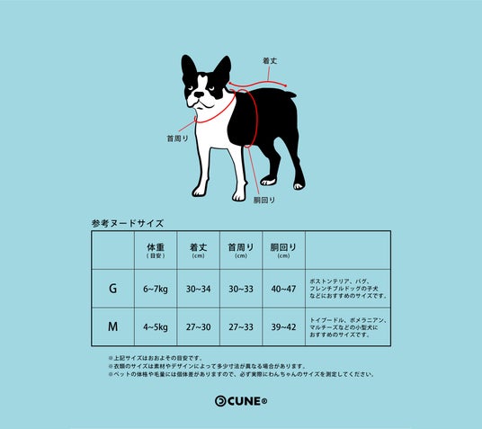 犬の服のサイズはGとMの2サイズの仕様で、Gはボストンテリアをメインにパグやフレンチブルドッグの子犬などにおすすめのサイズ。