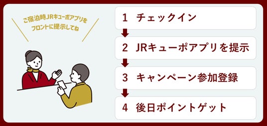 期間中、対象ホテルにご宿泊の際、フロントでJR キューポアプリをご提示のうえ参加登録をされたお客さま(代表者さま)に、1チェックインあたりJR キューポ100 ポイントをもれなくプレゼント