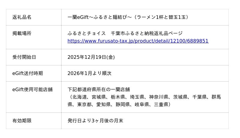 株式会社一蘭は、千葉市へのふるさと納税返礼品として、東日本の一蘭店舗で利用できる電子ギフト「一蘭eGift ~ふるさと麺結び~」の提供を開始いたします。