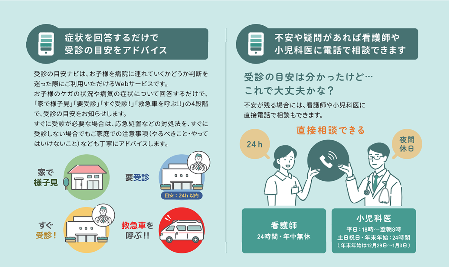- 当てはまる症状がない場合や判定結果に不安がある場合は、看護師や小児科医に電話で相談することができます。(WEB入力した内容は相談先に共有されるため、スムーズに相談できます)