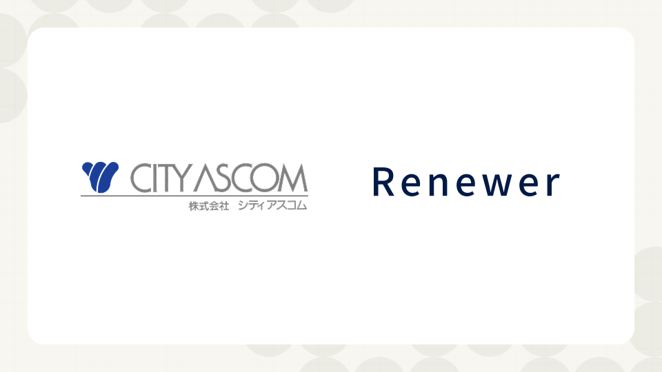 株式会社Renewer(本社:東京都渋谷区、代表取締役CEO:堀内 亮平、以下「Renewer」)は、株式会社シティアスコム(本社:福岡県福岡市、代表取締役社長:池田 勝、以下「シティアスコム」)と、企業における生成AI活用を支援することを目的として、業務提携契約を締結したことをお知らせします。