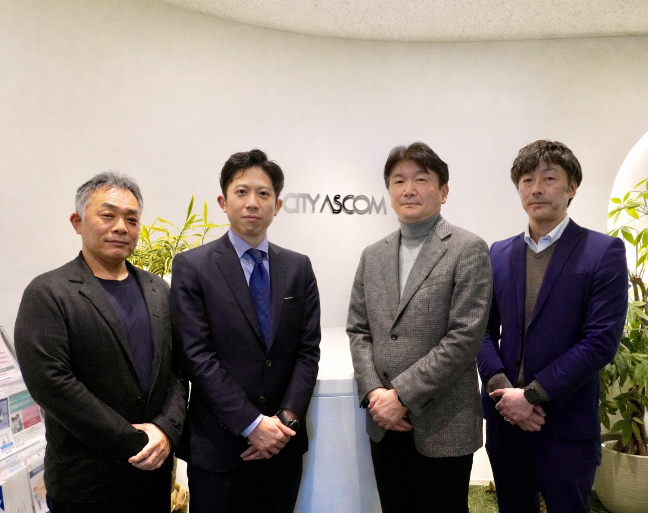 左から:株式会社シティアスコム 営業本部 グループ統括部 部長 林田 利彦氏、株式会社Renewer 代表取締役CEO 堀内 亮平、株式会社シティアスコム 代表取締役専務 福嶋 正道氏、株式会社シティアスコム デジタルイノベーションサービス本部 BPO事業部 部長 長尾 龍太氏