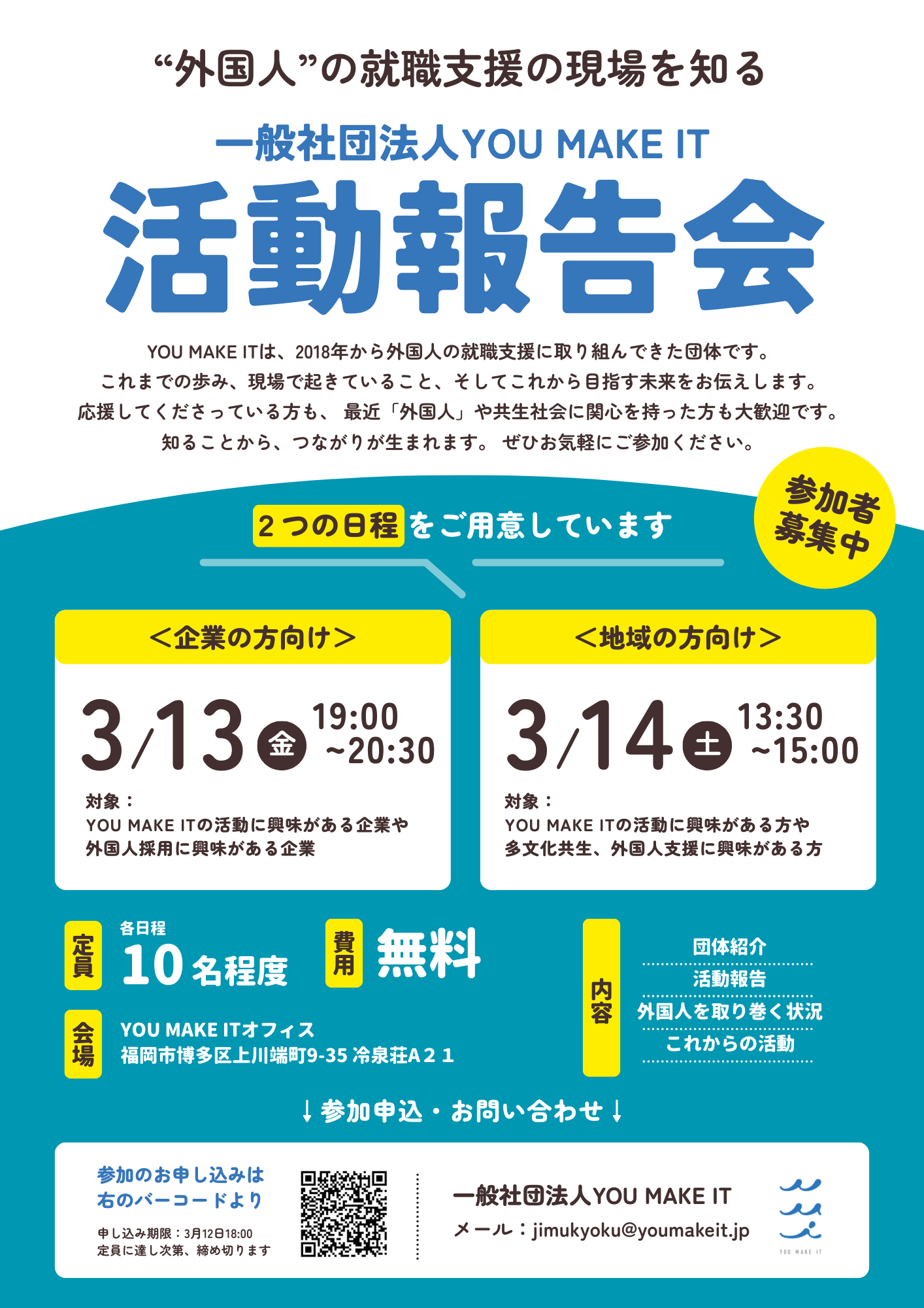 福岡県福岡市を中心に外国人のキャリア・就労支援を展開する一般社団法人YOU MAKE IT(本社:福岡県福岡市、代表理事:楳木健司)は、2026年3月13日(金)・14日(土)の2日間、団体設立以来初となる「活動報告会」を自社オフィス(冷泉荘)にて開催いたします。
