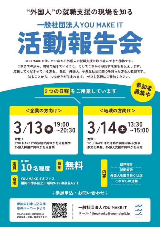 【参加者募集中】外国人就労支援の「YOU MAKE IT」、設立以来初となる活動報告会を3月13日・14日に開催