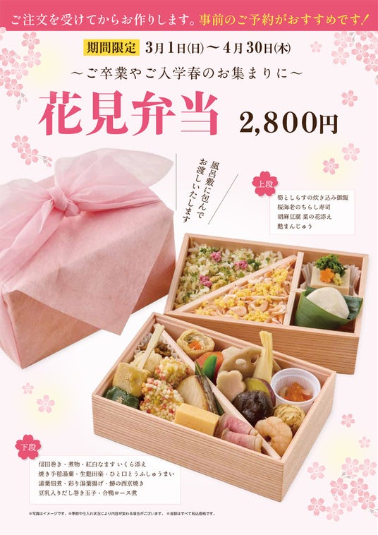 株式会社梅の花サービス(本社:福岡県久留米市、代表取締役:野田安秀)が運営する湯葉と豆腐の店 梅の花は、2026年3月1日(日)から4月30日(木)までの期間限定で、春の訪れを感じる「花見弁当」を販売いたします。