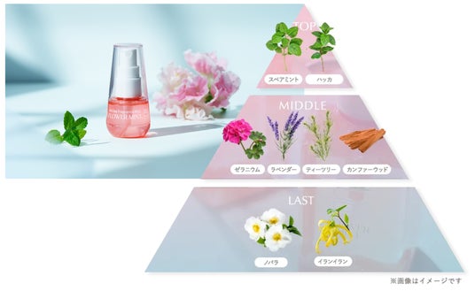 限定シャンプー「kurokamiスカルプ(スプリングレシピ)」と同じ香りで仕立てた、30mLのオールデイフレグランスミストです。ミントがすっきりと寄り添いながら、ローズやイランイラン、ラベンダーなどの花々がやさしく重なる、甘さと深みのある香りが特長です。軽やかな立ち上がりと、乾いたあとにほのかに残る余韻のバランスにこだわりました。ルームスプレーとして空間に使用できるほか、髪のフレグランスミストとしてもお使いいただけます。スプリングレシピとお揃いのデザインで、花びらをイメージしたフォルムを採用しました。