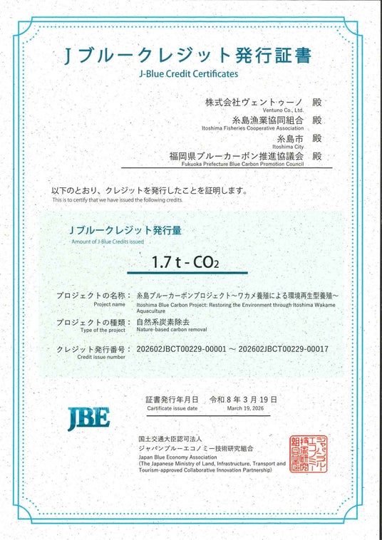このたび、株式会社ヴェントゥーノ、糸島漁業協同組合及び福岡県ブルーカーボン推進協議会と共同でクレジット認証を申請した「糸島ブルーカーボンプロジェクト」が、2025年度Jブルークレジット(R)認証を取得しました。