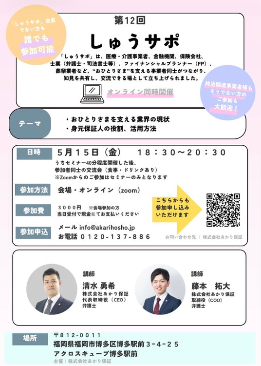 弁護士・司法書士・ケアマネジャーなどの専門家と連携し、身元保証サービスを提供する株式会社あかり保証(代表取締役・弁護士:清水勇希、本社:大阪府大阪市)は、おひとりさまを支える事業者コミュニティ「しゅうサポ」の第12回を福岡にて開催いたします。本開催は福岡事務所の開設に伴い、同地域での初開催となり、今後の九州エリアにおける連携強化の第一歩と位置付けております。