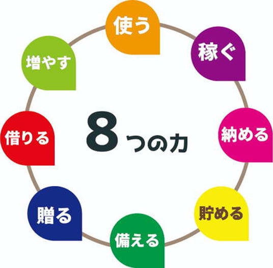 当機構が提唱する「お金の8つの力」(使う・稼ぐ・納める・貯める・備える・贈る・借りる・増やす)