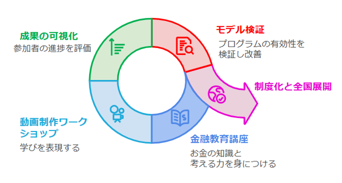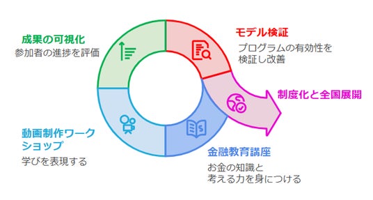 さらに、本事業で得られた成果を基にプログラムのモデル化を進め、全国展開が可能な金融教育事業としての制度化を目指します。