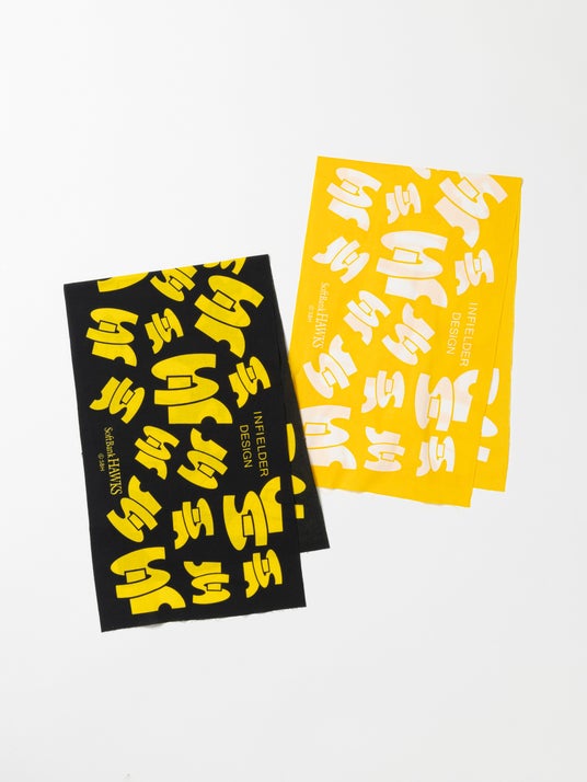 「INFIELDER DESIGN」の手ぬぐいをボディに、ホークスのロゴをモチーフにした総柄のグラフィックを施しました。応援シーンはもちろん、首元やバッグに巻くだけでスタイリングのアクセントにも。インテリアとして飾っても存在感のあるデザインです。