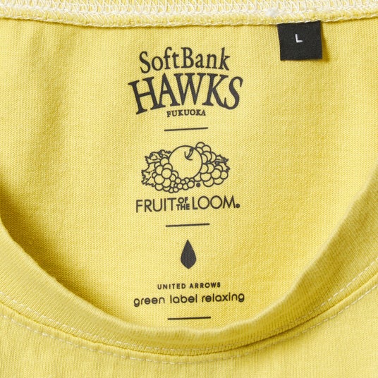 米国のカジュアルウェアブランド「フルーツオブザルーム(FRUIT OF THE LOOM)」のボディ(本体)を採用しました。背中内側にホークス、フルーツオブザルーム、グリーンレーベルそれぞれのネームが入っています。