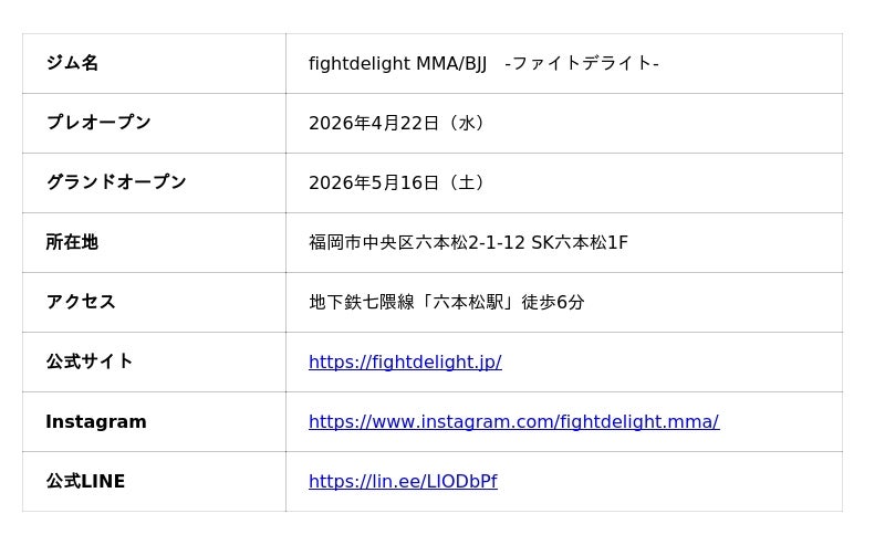 格闘技を通じて「強さ」に向き合い、人生を喜びで満たしていく「fightdelight(ファイトデライト)」は、2026年4月22日、福岡市中央区六本松にプレオープンしました。格闘技未経験の方から本格的に競技を目指す方まで、幅広い方々が「本質的な強さ」を磨ける場を提供します。